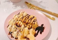 190 г • вафли, банан, сливочный крем, шоколадный топпинг